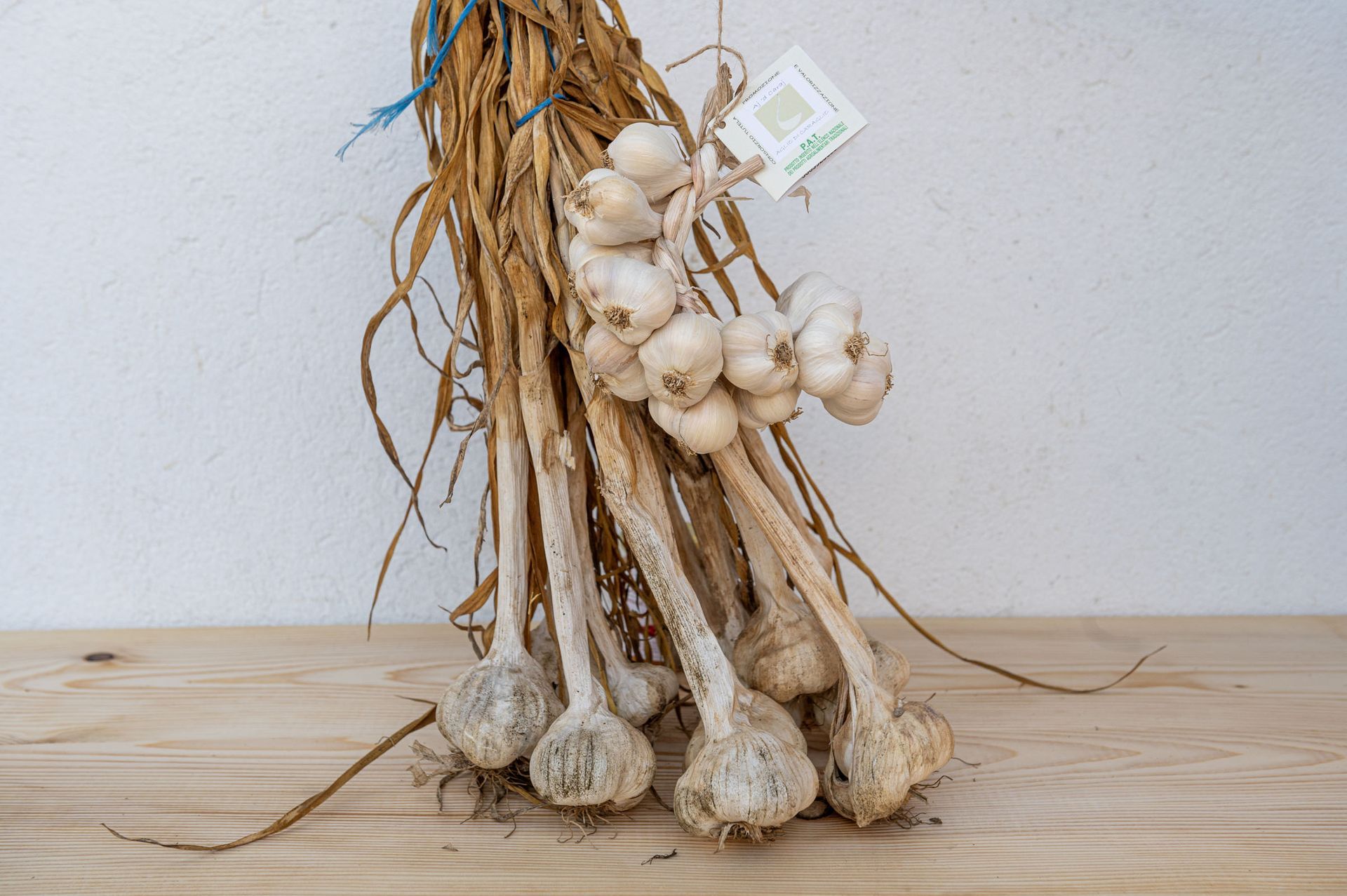 La raccolta di questo prodotto avviene ogni anno attorno al giorno di San Giovanni, il 24 giugno, e dopo un periodo di essicazione di 40 giorni, l'aglio è pronto all'uso. Questo ingrediente, impiegato prevalentemente in cucina per la sua capacità di aromatizzare, si distingue anche per le sue naturali proprietà antibiotiche e anti-infiammatorie.